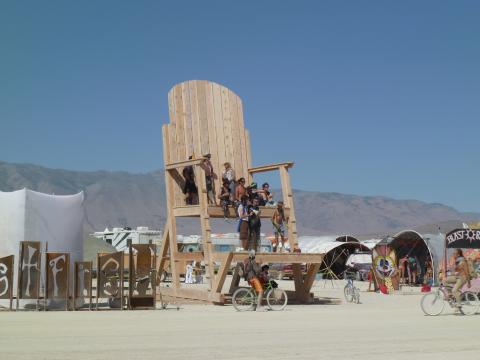 Giant wood chair on Esplanade, covered with people shouting abuse