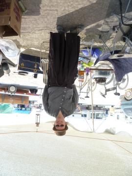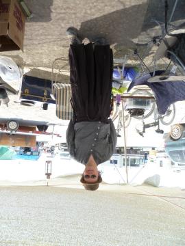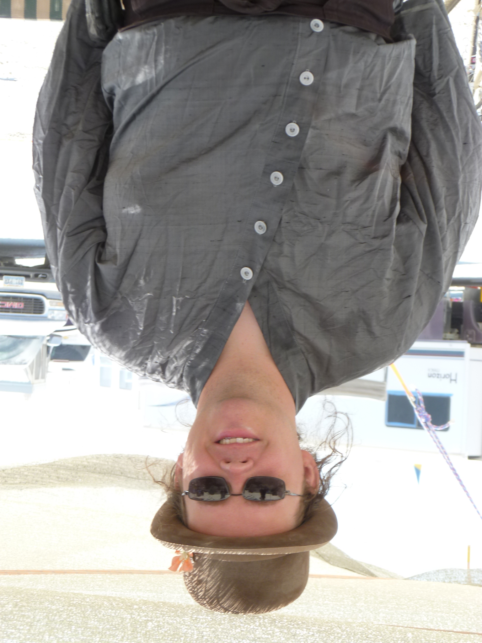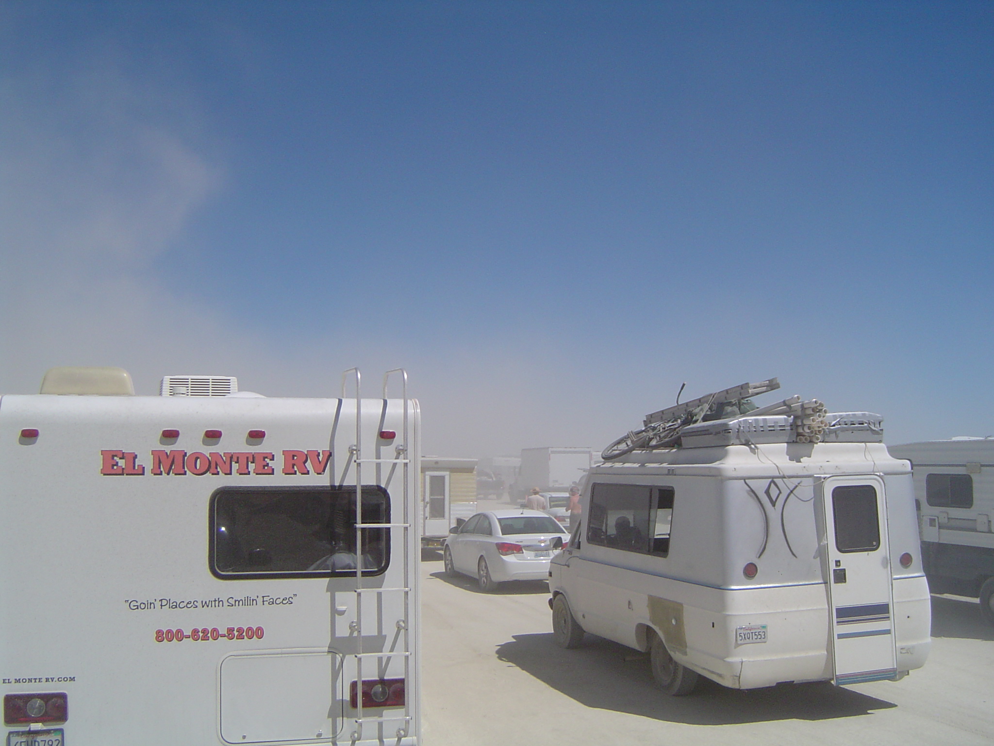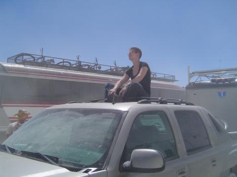 Ari sitting on the truck roof waiting in line