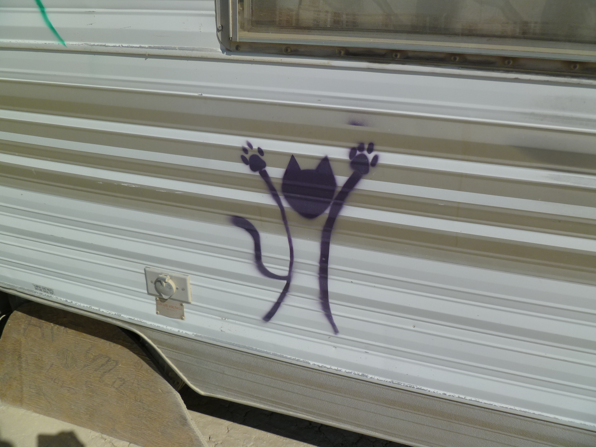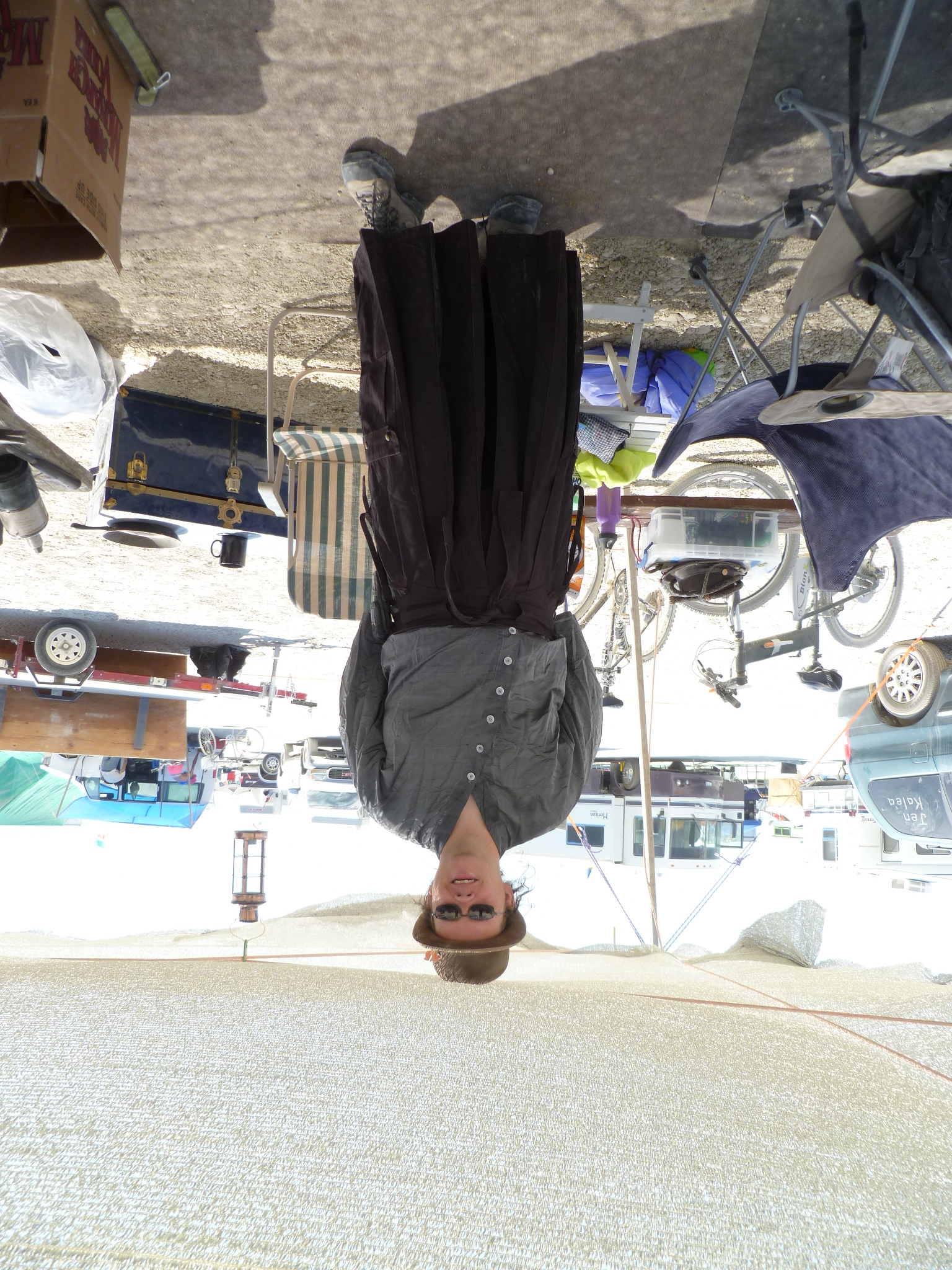 Kalamazoo sitting in front of camp, trailer