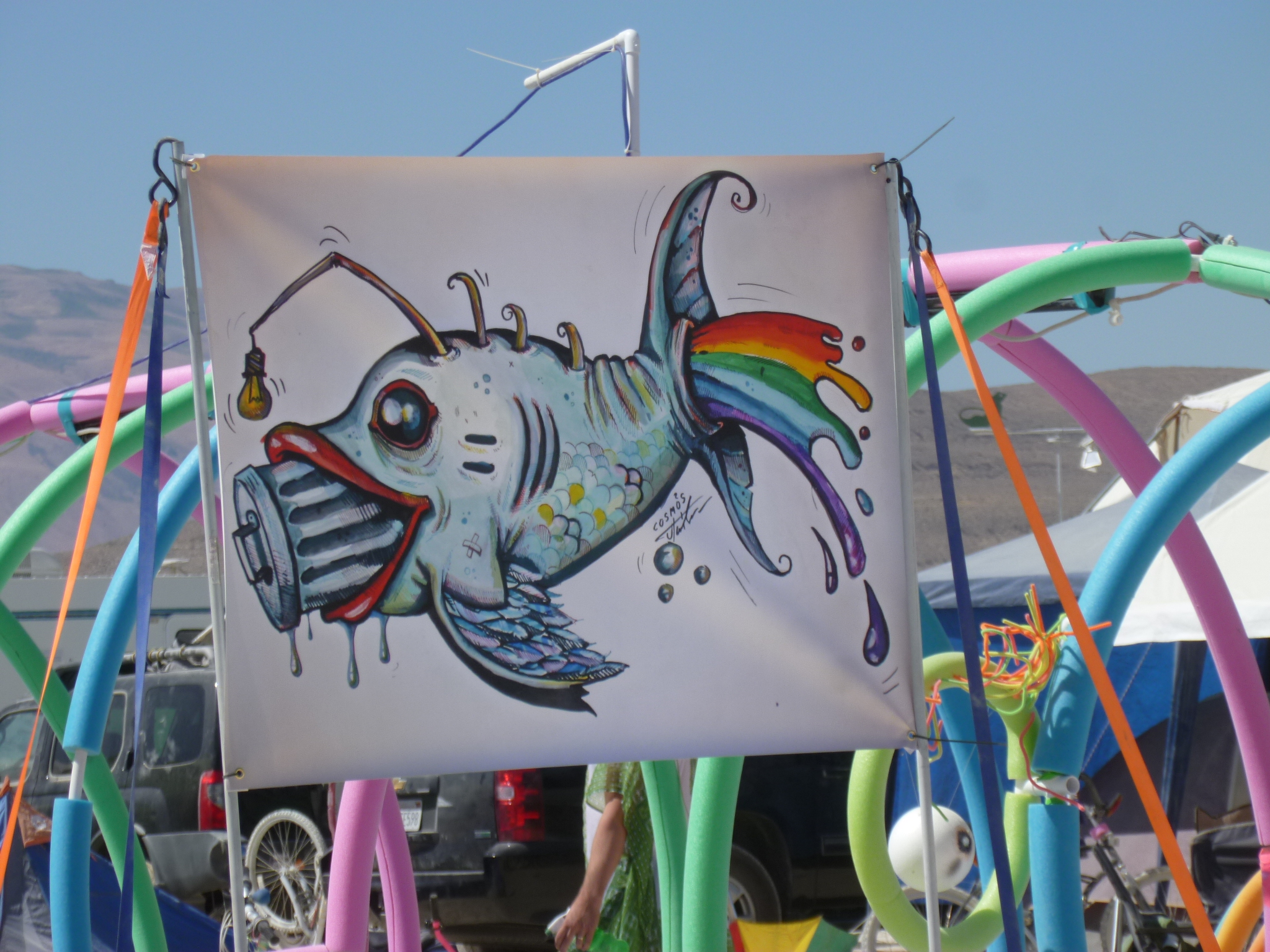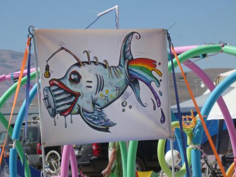 Fish eating garbage can popping rainbow banner