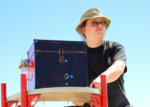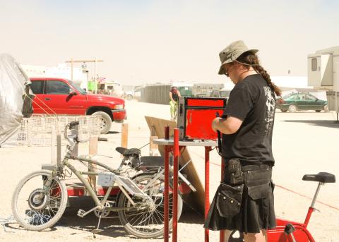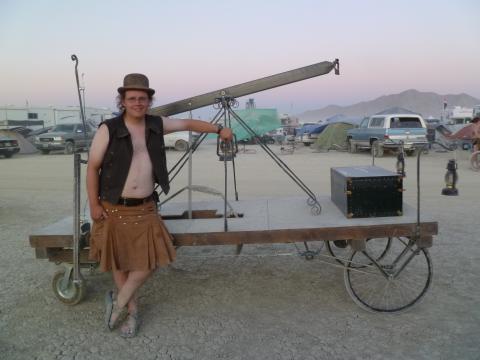 Guy on a two level bodged electric bike platform (Jen)
