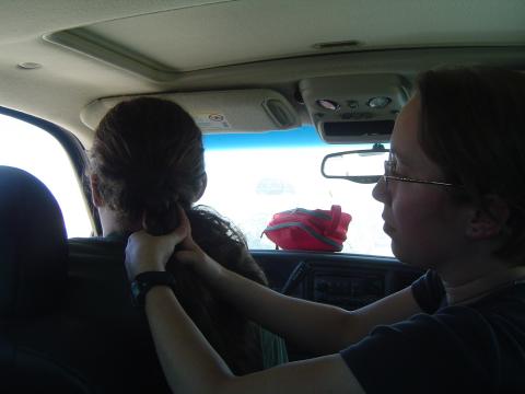 Monica braiding Fish's hair while waiting in line