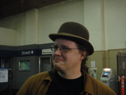 Fish in bowler, picking people up at the train station after Worldcon